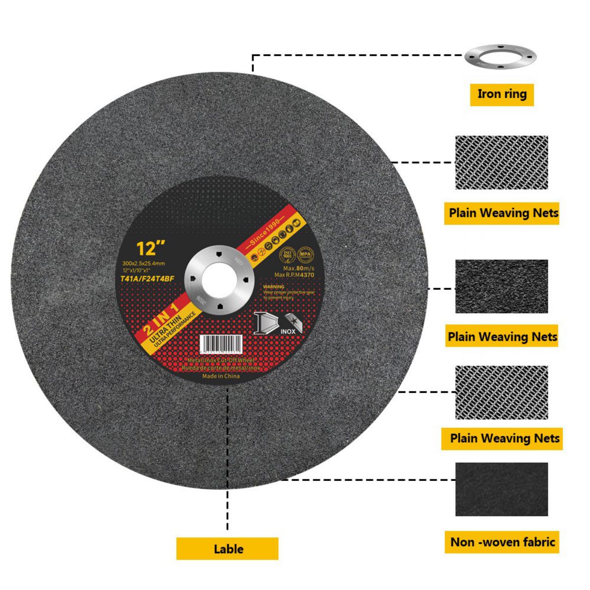 تجعل هذه الميزات أقراص القطع مقاس 12 بوصة الخاصة بنا ممتازة في قطع المعادن وتلبي معايير السلامة والأداء للبيئات الصناعية.