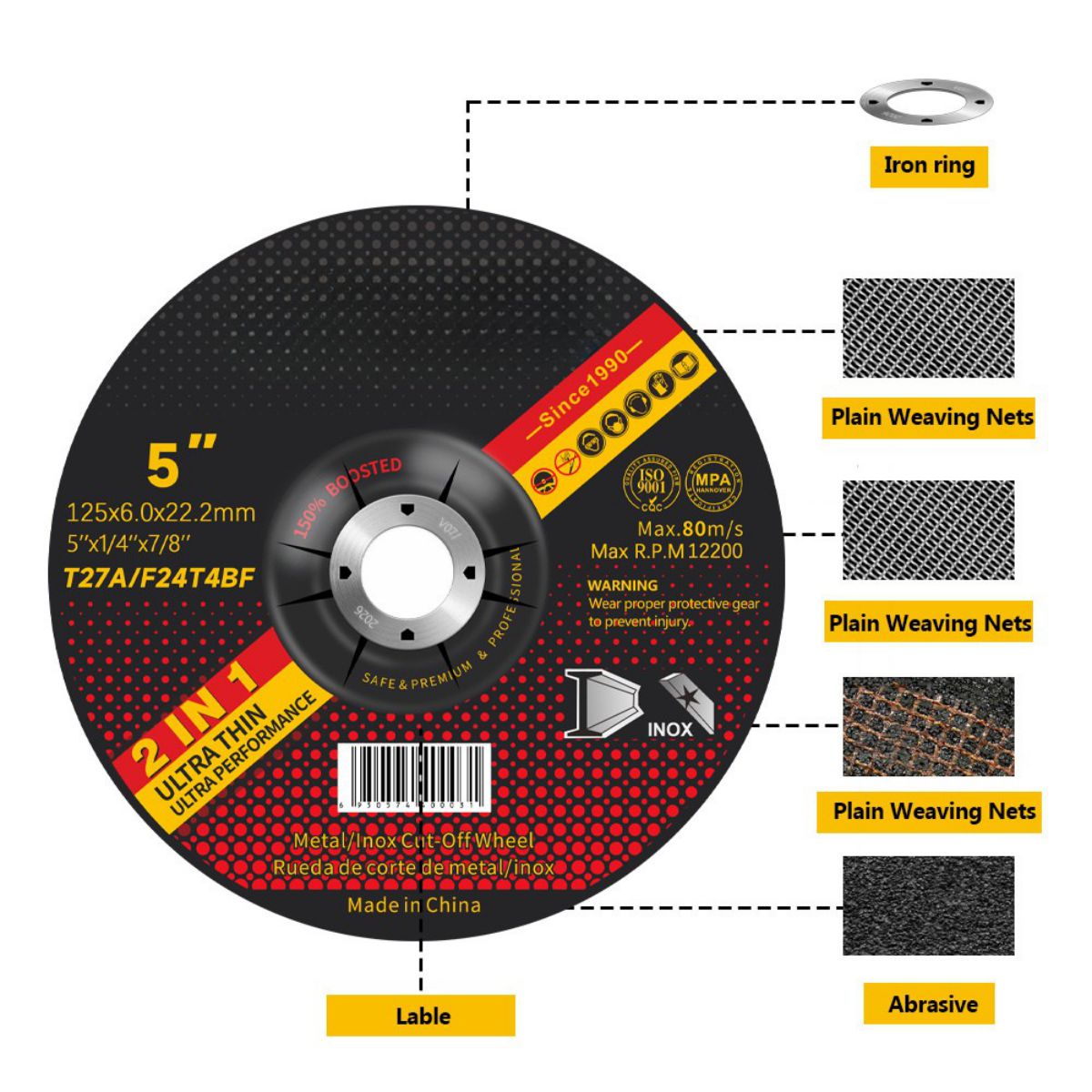 شركة تشينغ يانغ®، المتخصصة في تصنيع أدوات الطحن، تُزوّد عملاءها الصناعيين حول العالم بعجلة طحن شبكية مزدوجة متوافقة مع معيار EN12413. يعتمد المنتج الرئيسي لقرص الطحن T27 بقطر 125 مم على هيكل مُقوّى بشبكة ألياف زجاجية مزدوجة، بسمك مُتحكم فيه بدقة يتراوح بين 6.0 مم ± 0.2 مم، مما يُوازن بين كفاءة القطع ووفرة السلامة.