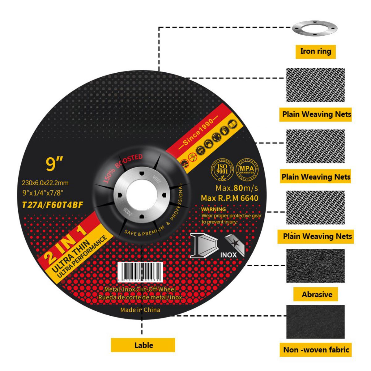 قرص الطحن هذا مقاس 9 بوصات/عجلة الطحن مقاس 9 بوصات بقطر ثقب قياسي 22.2 مم (7/8 بوصة)، وهو مناسب لمعظم ماركات ماكينات الطحن الزاوية الشائعة. وباعتباره قرصًا مهمًا لماكينات الطحن الزاوية المعدنية، يمكنه التعامل مع مجموعة متنوعة من أقراص الطحن المعدنية.